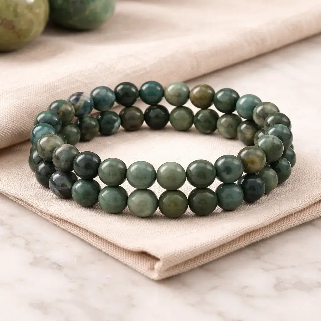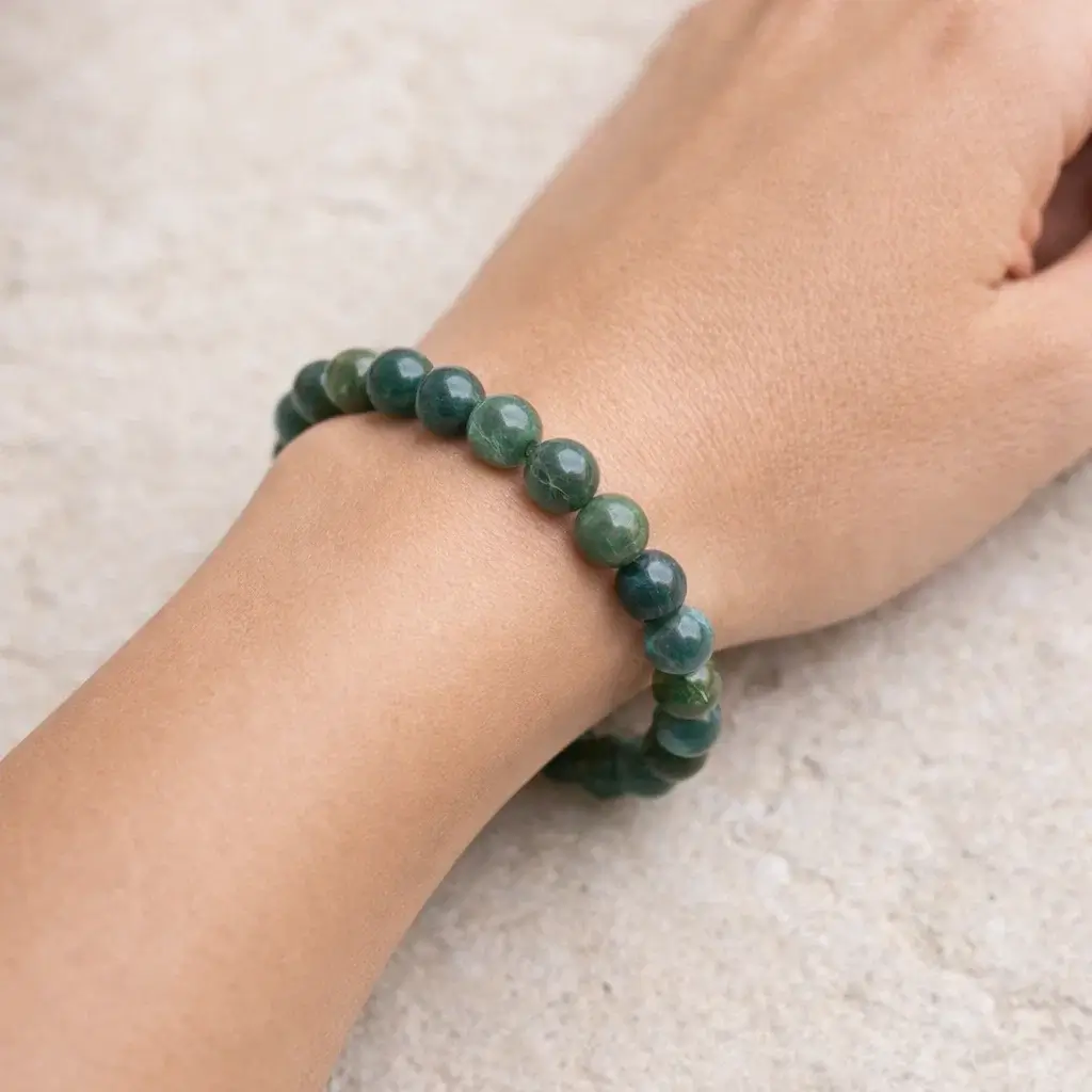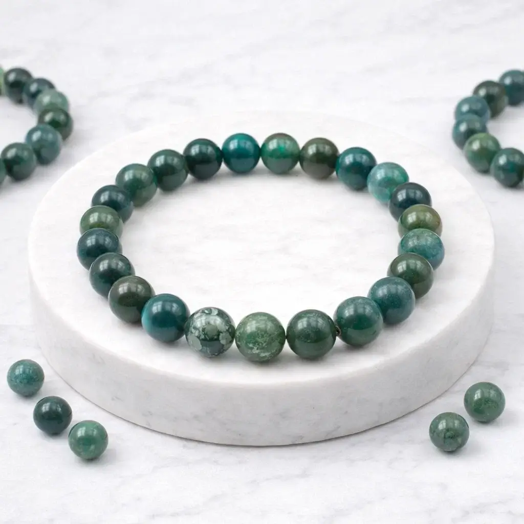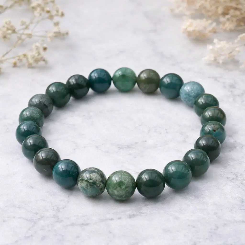 Discover the calming and grounding energy of our Moss Agate Bracelet, crafted from authentic green moss agate beads. Revered for centuries as a stone of new beginnings and emotional healing, moss agate is believed to restore balance, reduce stress, and encourage personal growth. Each bead is carefully selected for its natural beauty, featuring unique moss-like inclusions that make every bracelet one-of-a-kind.