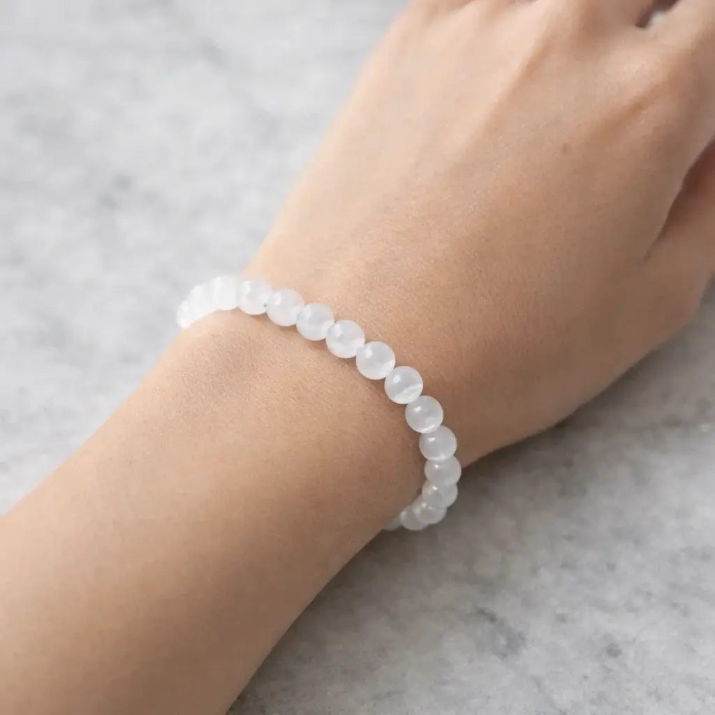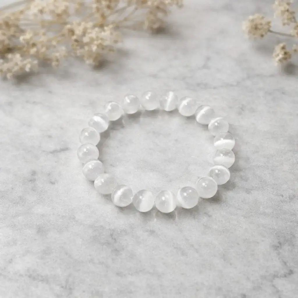 Bring a sense of purity and calm to your jewelry collection with the Selenite Grande Gems 10mm Large-Eyed Bracelet. Crafted with smooth, generously sized 10mm beads, this bracelet highlights the natural glow and silky texture that makes selenite so distinctive.