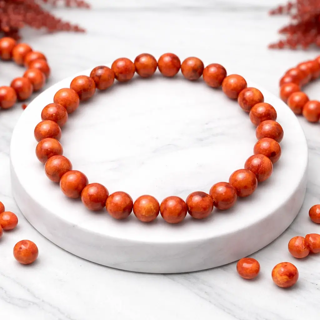 Sponge coral is formed from the natural skeleton of marine organisms and is rich in natural minerals. Its fine texture and warm coral tones create a unique and eye-catching look in this bracelet.